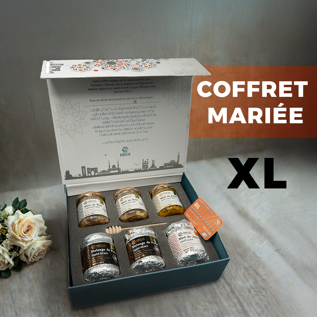 Coffret Marié هو مجموعة مميزة من العسل الطبيعي ومنتجات النحل الفاخرة مصممة خصيصًا للأزواج لتعزيز النشاط، الحيوية، والقوة بطريقة طبيعية وآمنة.