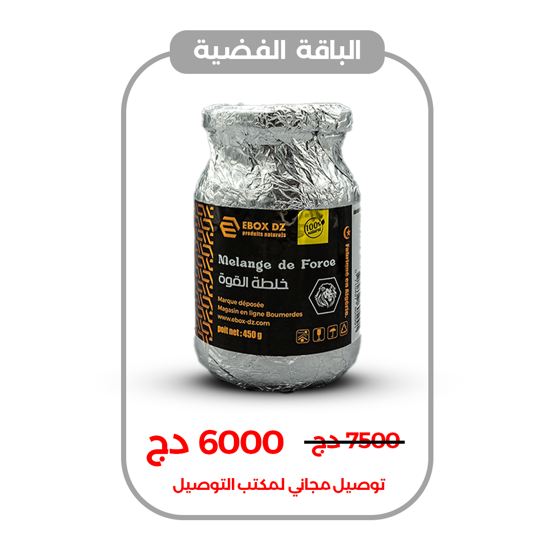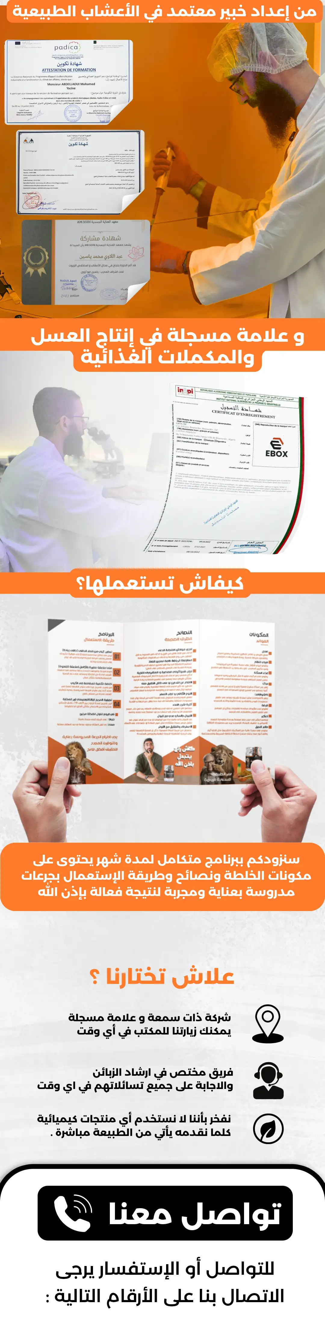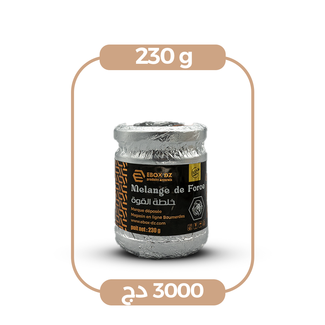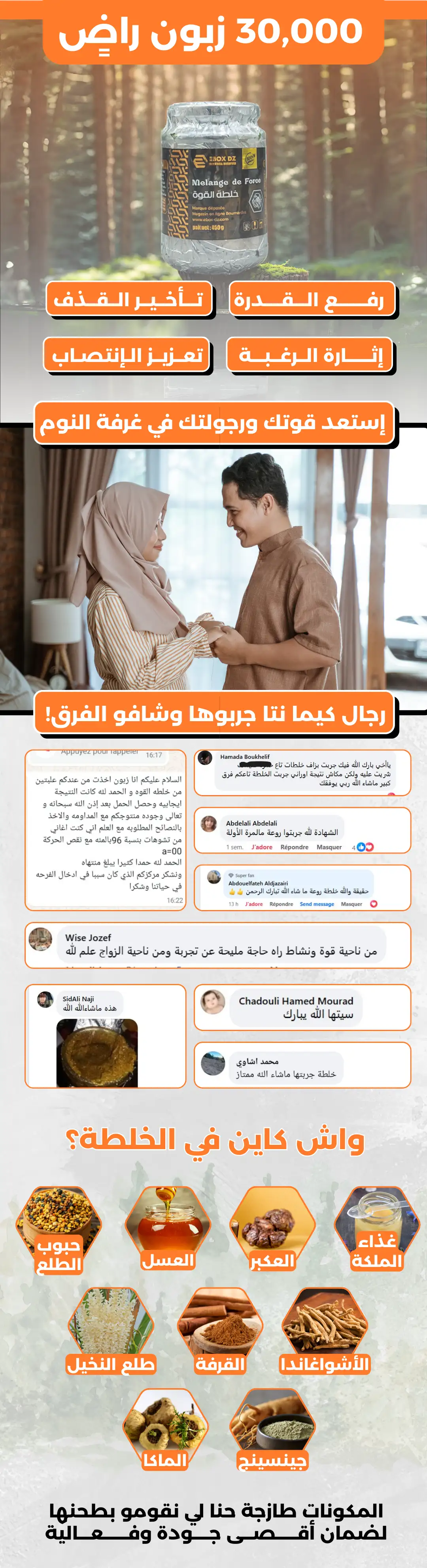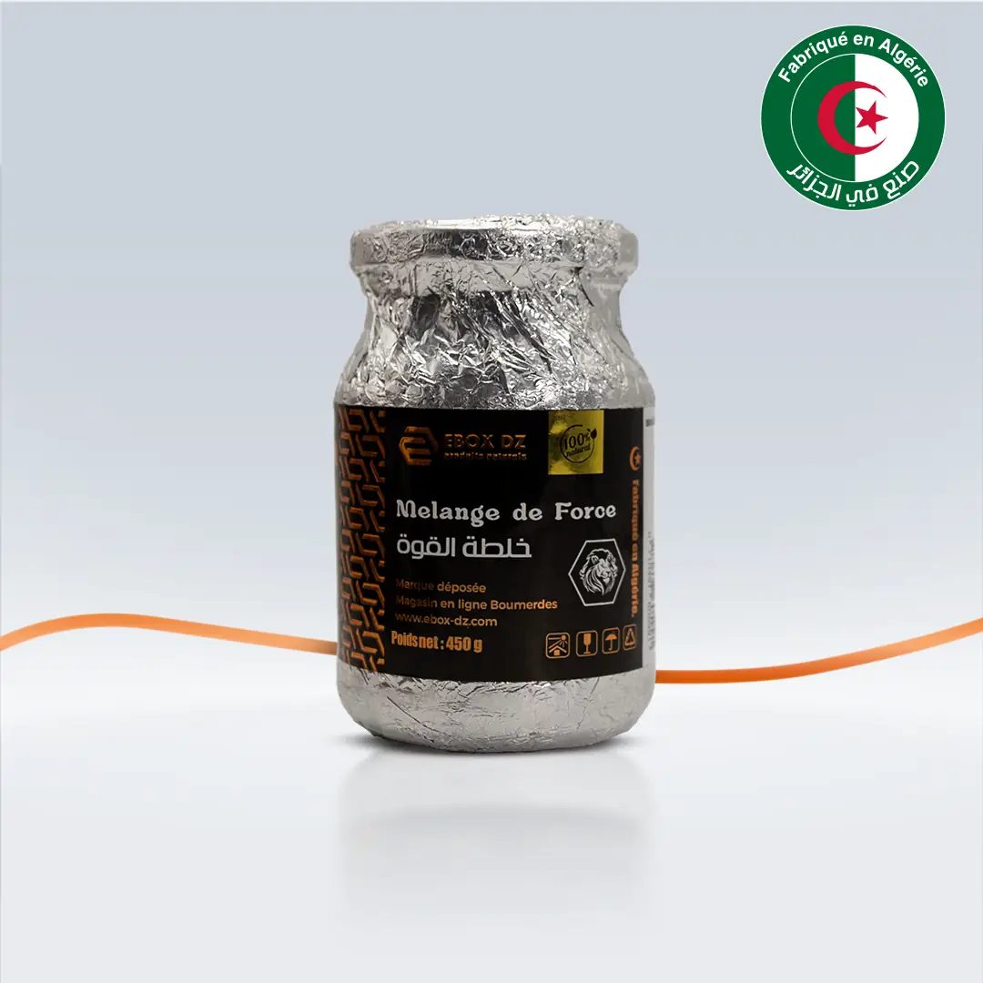 خلطة القوة الطبيعية لرفع القدرة معدة من طرف خبراء بمزيج من المكونات الطبيعية 100% الطازجة كطلع النخيل و حبوب اللقاح و العسل الطبيعي و الجينسينج و العكبر و ايضا غذاء الملكة و الاشواغاندا هاته الخلطة خالية تماما من اي اضافات او مواد كيميائية ضارة.