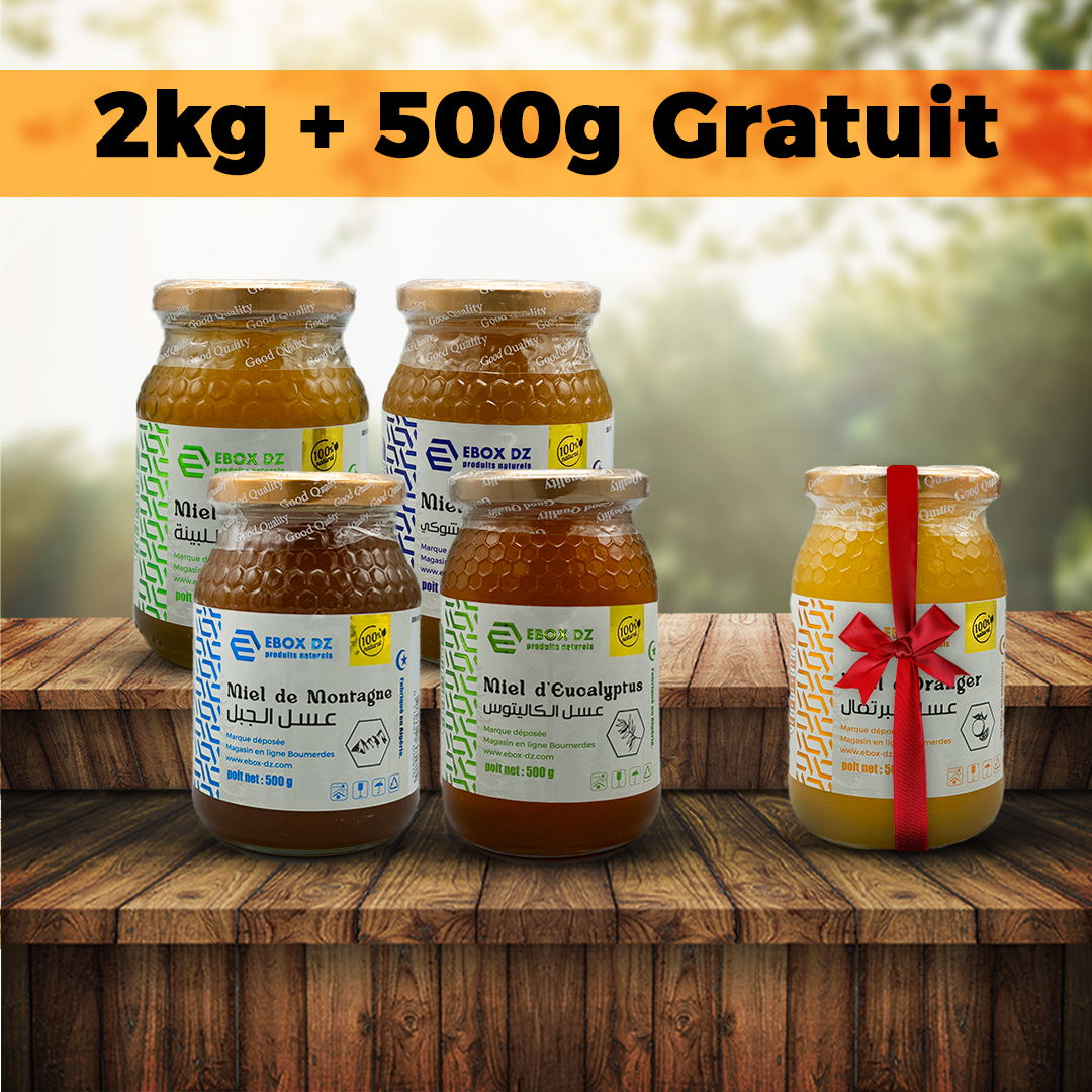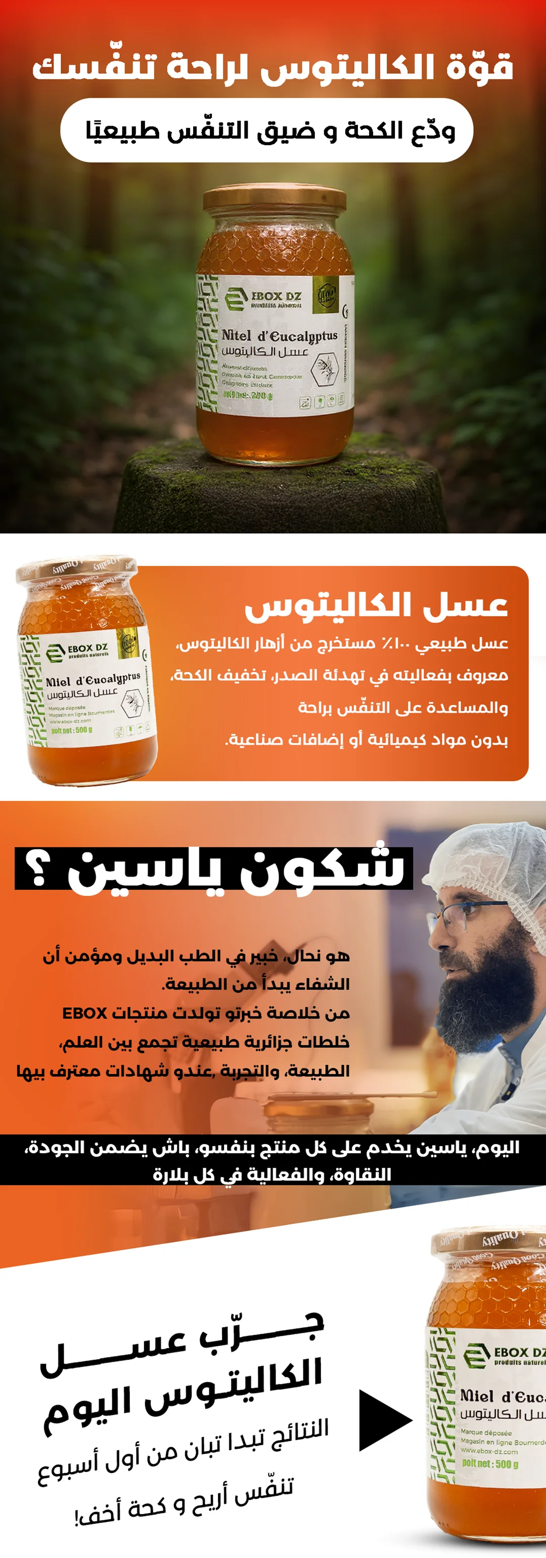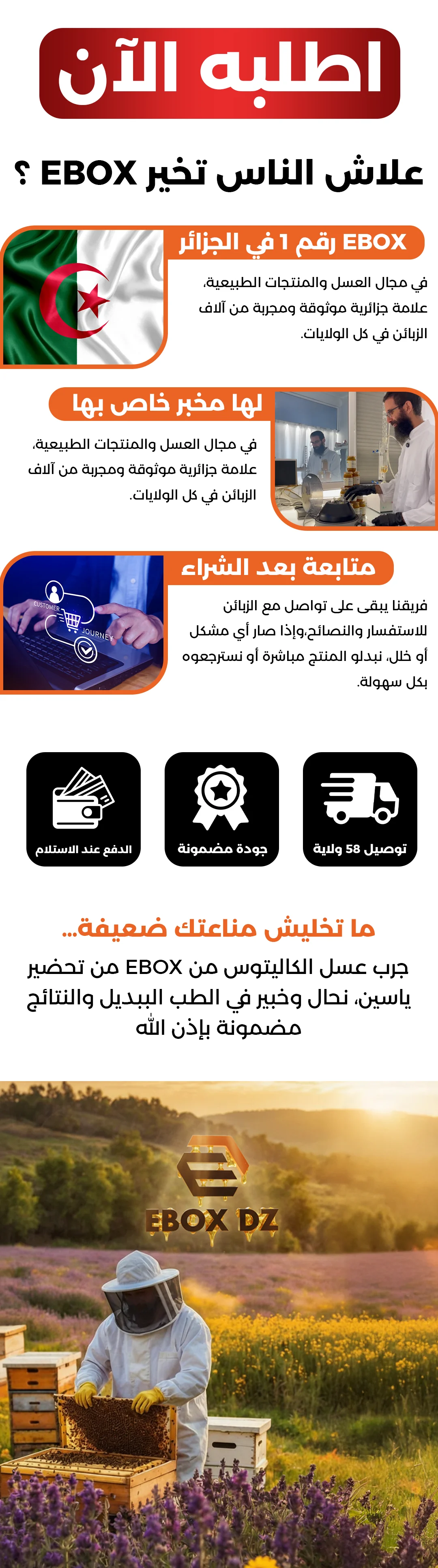 عسل الكاليتوس عسل طبيعي 100% من ولاية مستغانم له فوائد عديدة يجدد خلايا الدم، مضاد للإلتهابات، يحفز الدورة الدموية، يعالج مشاكل الجهاز التنفسي.
