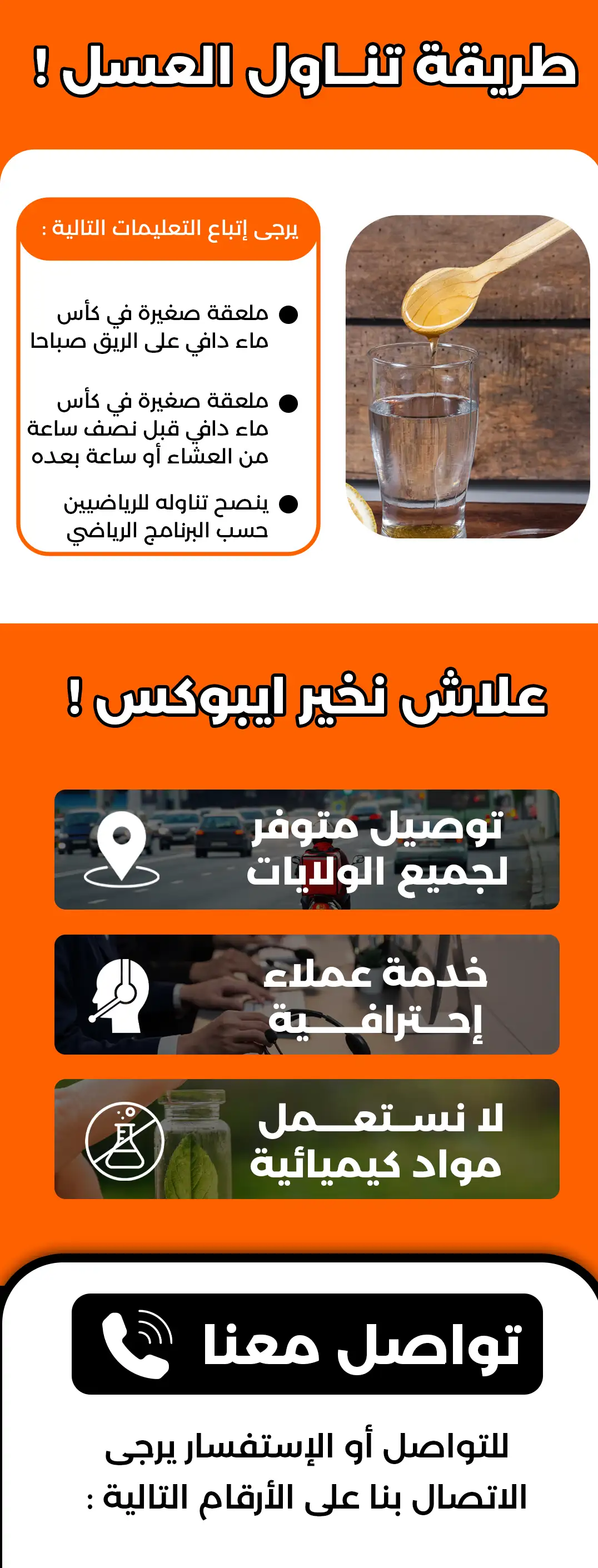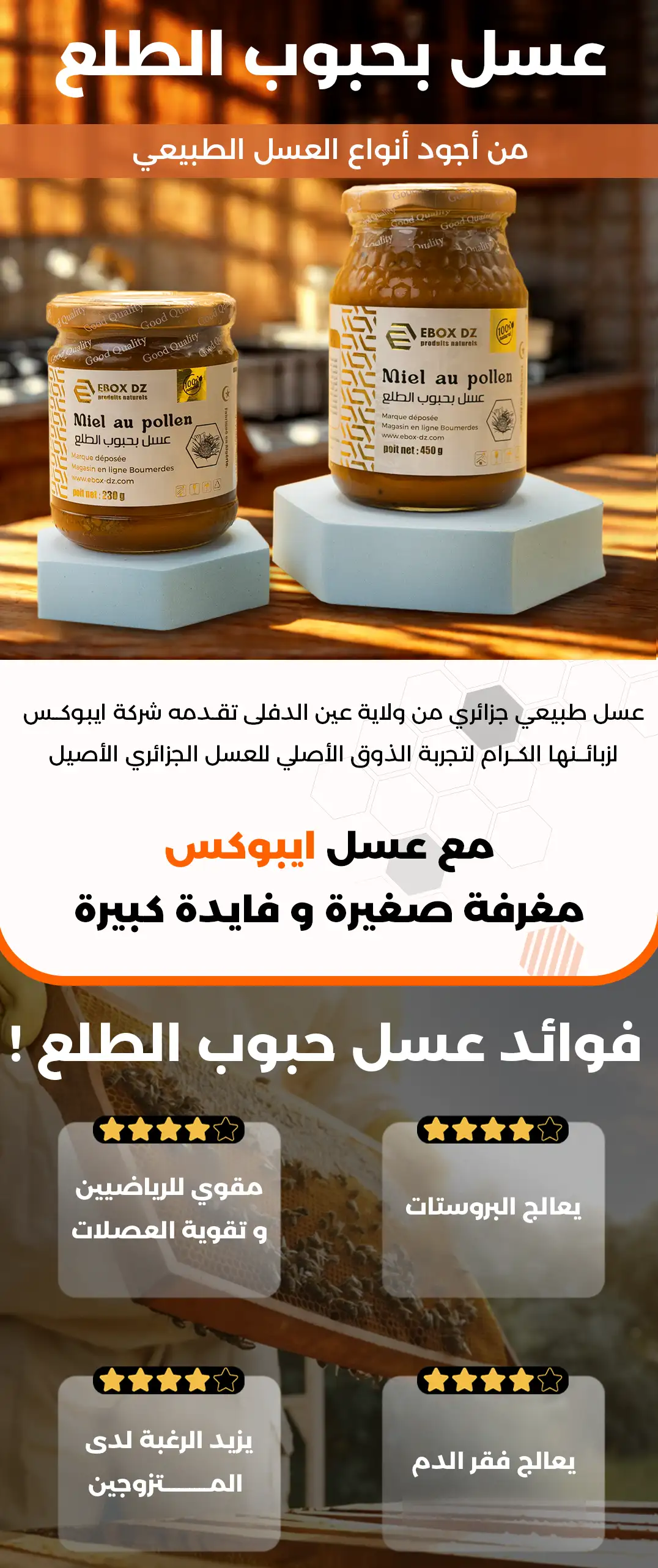 من الأفضل إضافة مطويات لكل طلبية وخاصة les coffrets cadeaux، تحتوي على فوائد العسل ومدى تلاؤمه وعدمه مع بعض الأمراض.. لأنه قد يكون المستفيد من الهدية لا يعرف قيمتها ولا حتى تأثيرها على صحّته.. شكراً EBOX